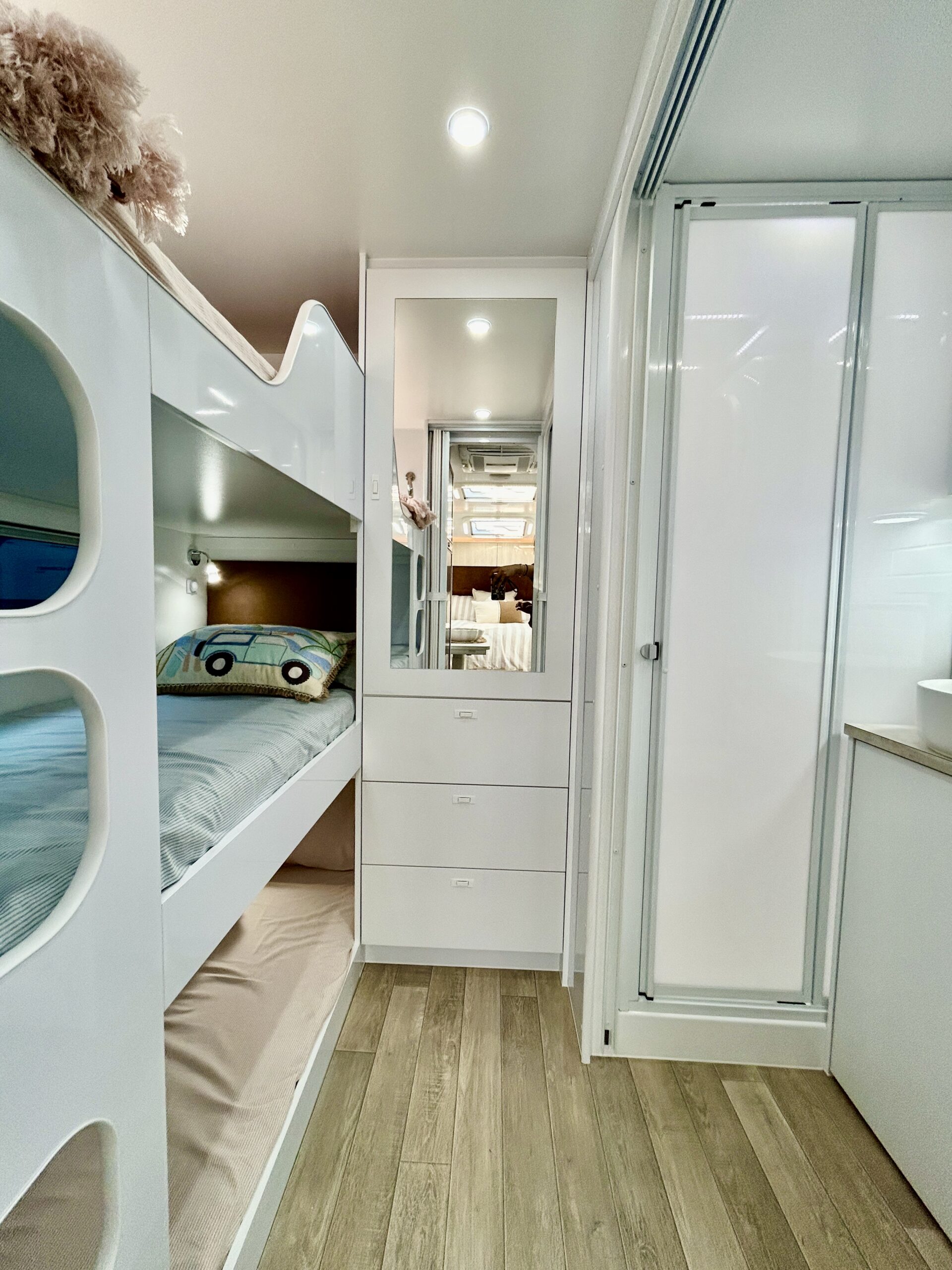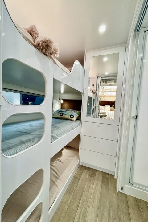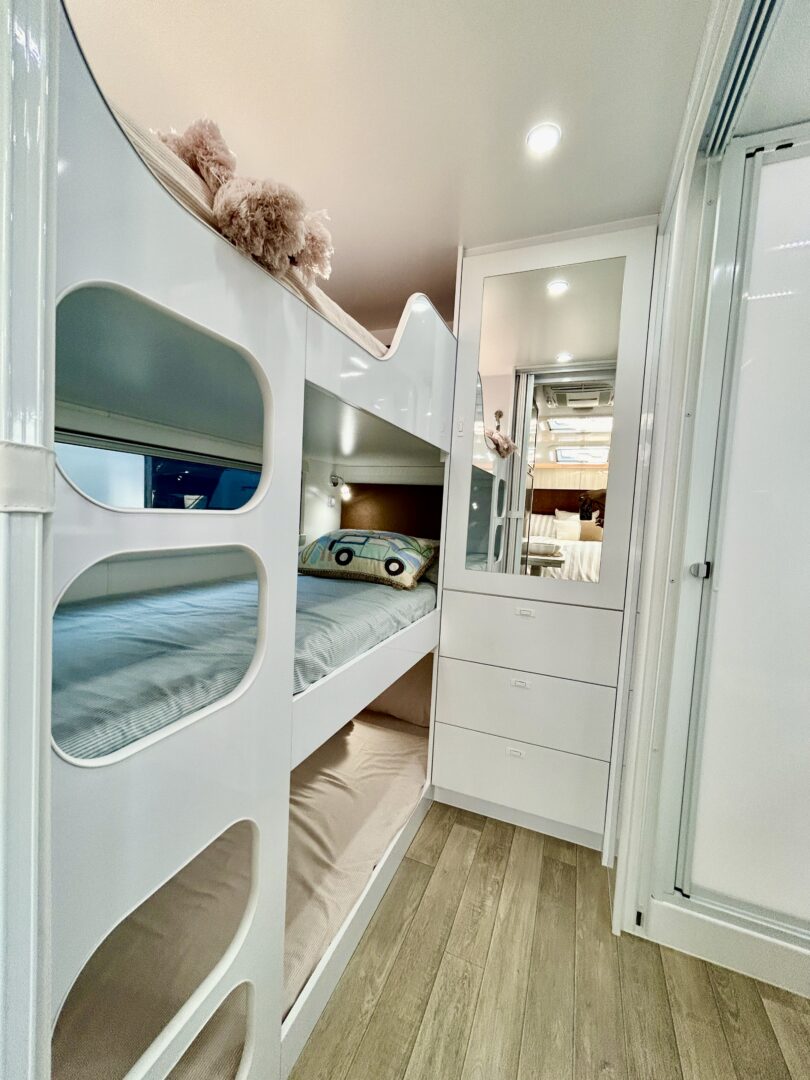 120 kg bunk loading capacity 9mm structural Grade Ply CAD designed, CNC router cut, Interlocking Jigsaw Frame where the walls, furniture and cabinetry are all locked into each other for superior strength, durability and off-road performance.